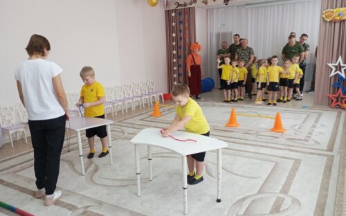 Праздник начался с красивого выхода детей под марш. Продолжилось торжество веселыми конкурсами, эстафетами для малышей и пап. Вот уж где пригодились сила, ловкость и командный дух!
